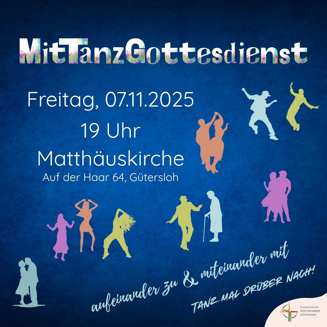 Schon im dritten Jahr in Folge feiern wir am Freitag, den 7. November, um 19 Uhr in der Matthäus-Kirche (Auf der Haar 64 in Gütersloh) einen MitTanzGottesdienst mit Tanz als Teil der Verkündigung und reichlich Gelegenheit zum Mittanzen. Musikalisch wird er von der Band „Sound of South“ gestaltet. Neugierig? Kommen Sie vorbei! Feiert mit!